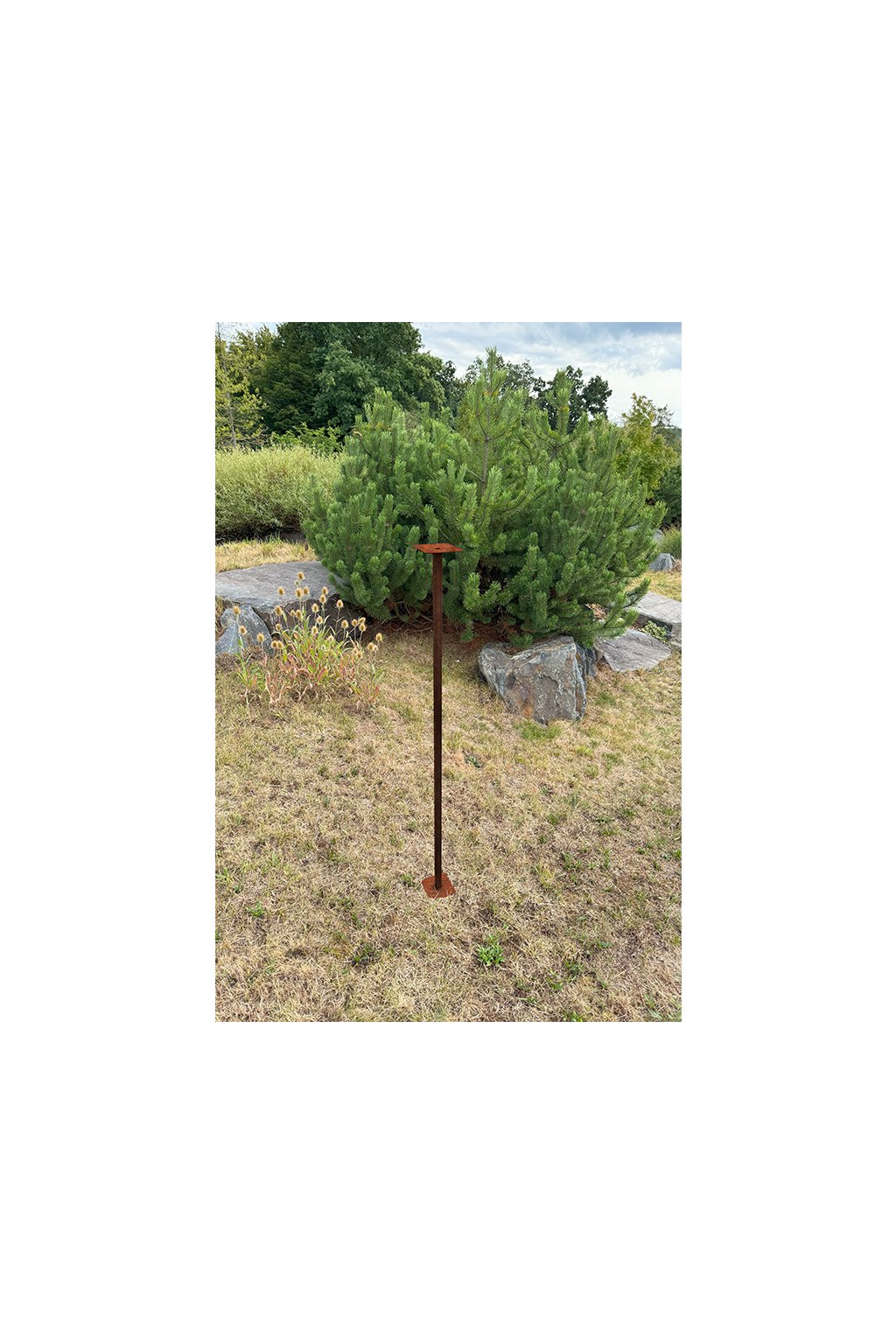 Tento stojan je navržen speciálně pro cortenová ptačí krmítka a umožňuje jejich umístění nezávisle na stromech, trámech či pergolách. Konstrukci tvoří pevný jekl 20 × 20 × 2 mm, na horní části je přivařený montážní plech s otvory, přes který lze krmítko jednoduše přišroubovat. Spodní část tvoří 22 cm dlouhý bodec, který se snadno zapíchne do země a spolu se spodním krycím plechem poskytuje maximální stabilitu. Samotná výška stojanu je 120 cm, takže po zapíchnutí s bodcem získá ideální výšku pro pohodlný přístup ptáků a přehledné umístění krmítka.