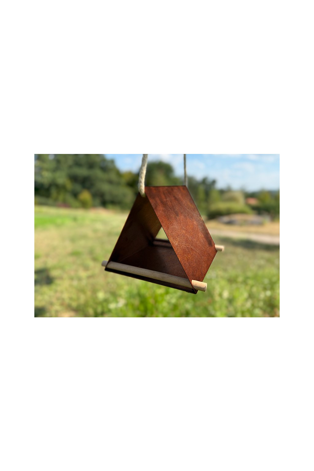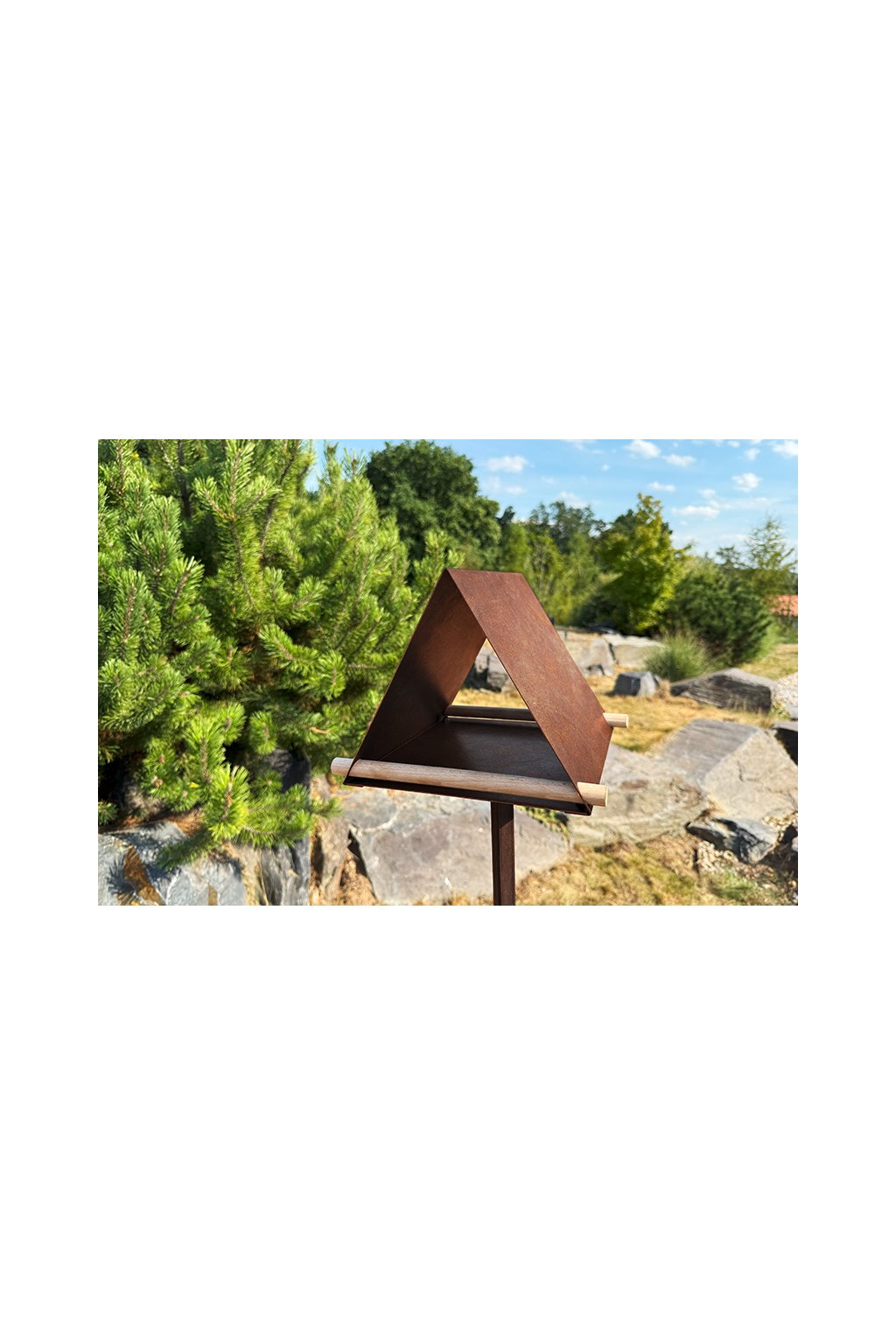 Materiálem krmítka je švédská ocel COR-TEN®, která přirozeně stárne a vytváří charakteristickou rezavou patinu. Ta nejen chrání krmítko proti další korozi, ale zároveň mu dodává zemitý, přírodní vzhled, jenž s časem zraje. Díky tomu je krmítko zcela bezúdržbové, ekologické a připravené čelit dešti, sněhu i slunci.