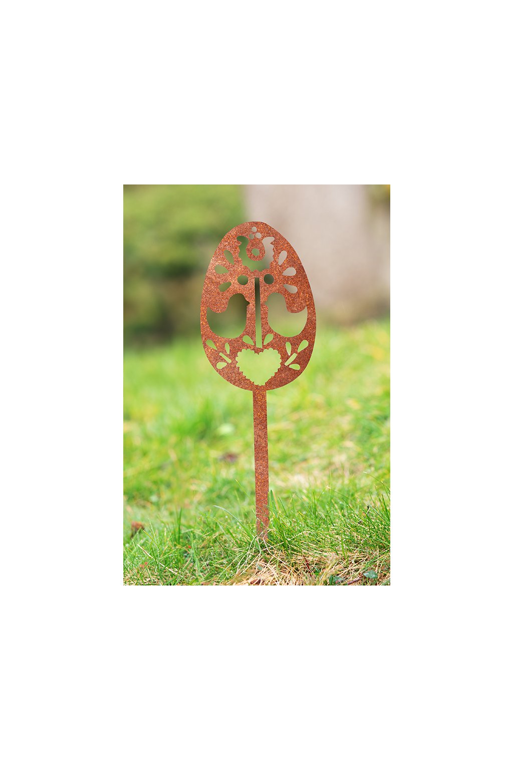 Zapichovací trn umožňuje snadné a pevné umístění do hlíny – bez nutnosti dalšího upevnění. Díky povrchové patině, která vzniká přirozenou oxidací, získává kraslice přírodní, zemitý tón, který krásně ladí s ostatní zelení i dřevěnými prvky.