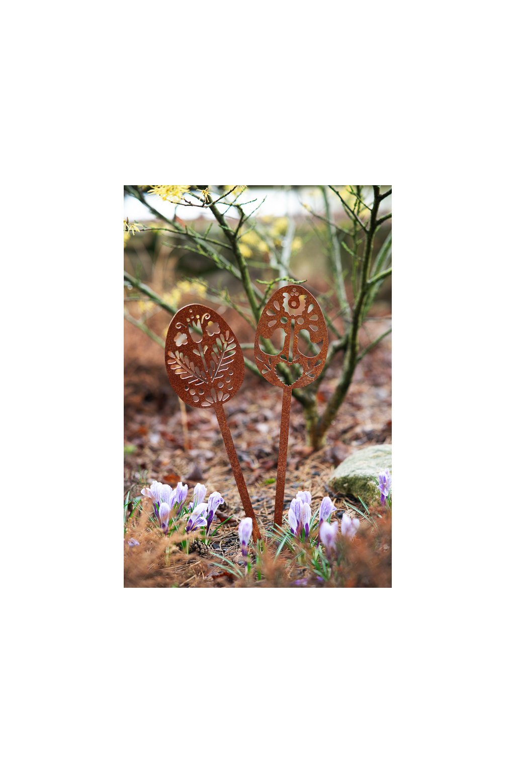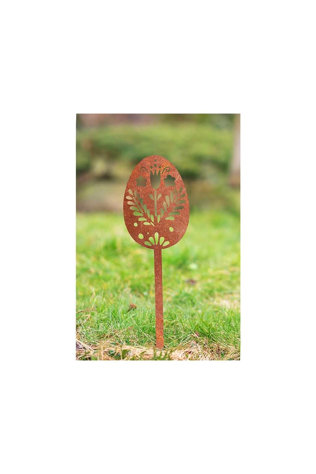 Zapichovací trn umožňuje snadné a pevné umístění do hlíny – bez nutnosti dalšího upevnění. Díky povrchové patině, která vzniká přirozenou oxidací, získává kraslice přírodní, zemitý tón, který krásně ladí s ostatní zelení i dřevěnými prvky.