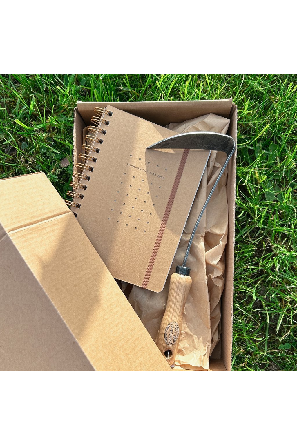 Univerzální sada obsahující zahradnický diář na rok 2026 a japonskou motyčku.
