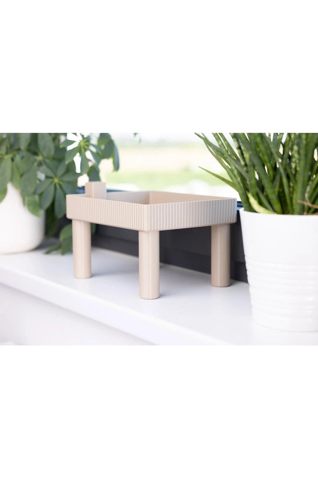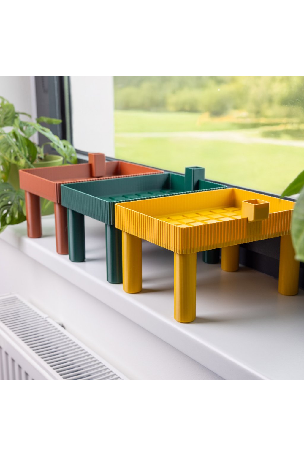 Praktický sadbovací stolek pro pohodlné předpěstování sazenic přímo na parapetu. Chrání rostliny před průvanem, zajišťuje rovnoměrnou zálivku odspodu a pomáhá jim růst vzpřímeně za světlem. Ideální v kombinaci s kostkovači: s menším pro 48 menších nebo s větším na 6 větších kostek.